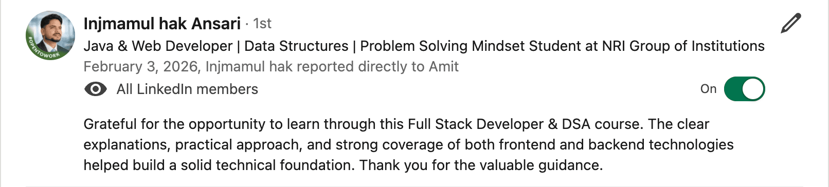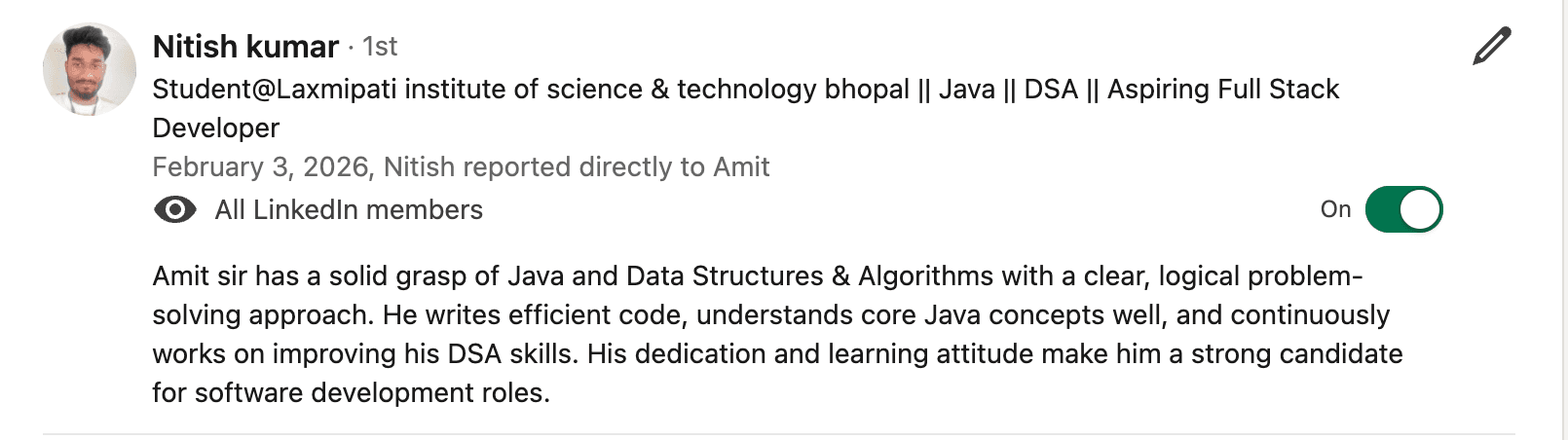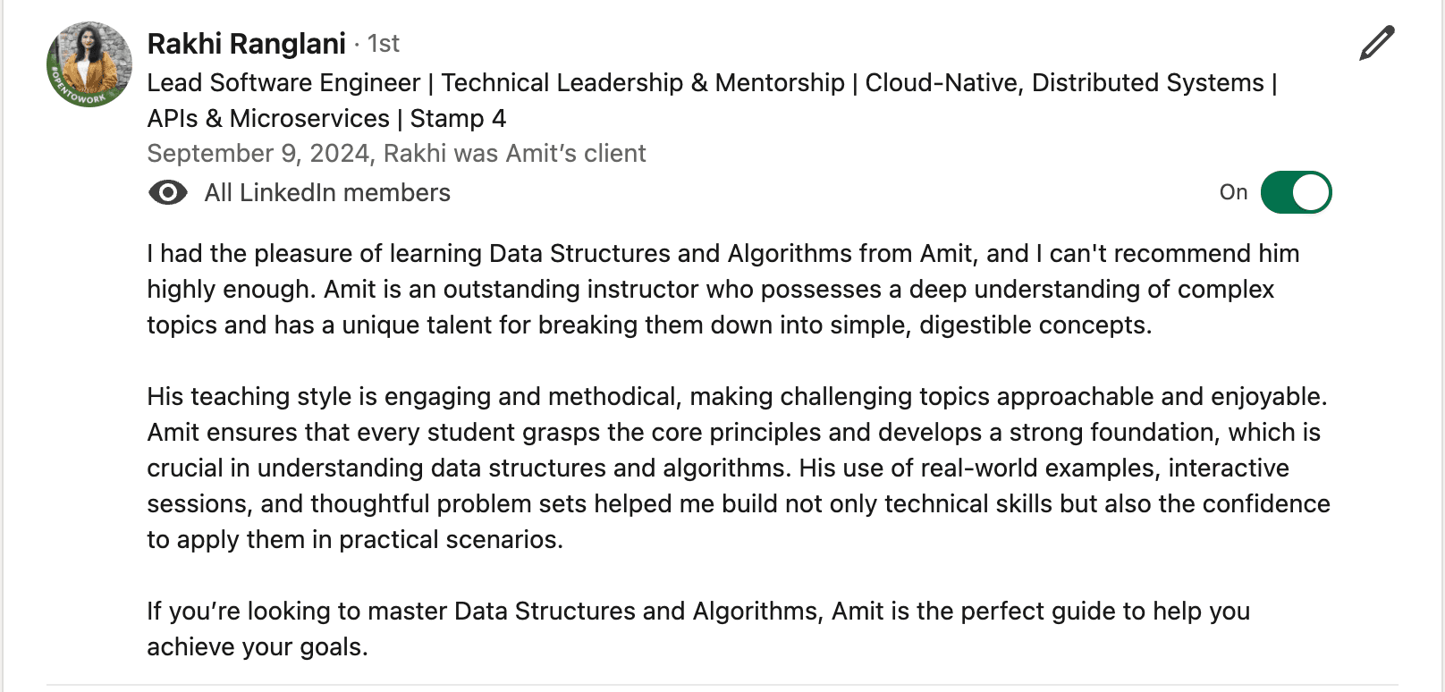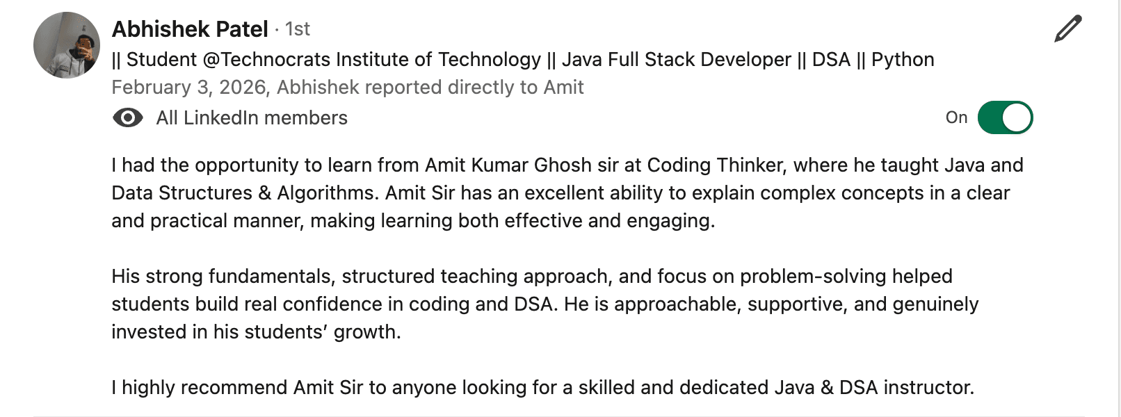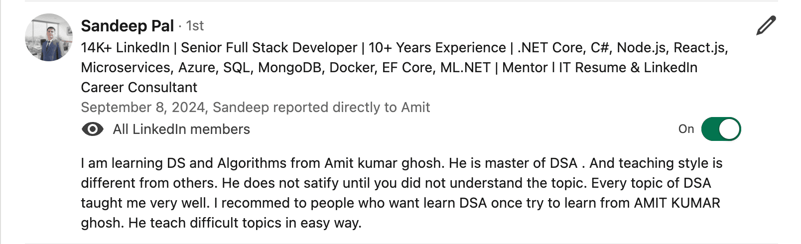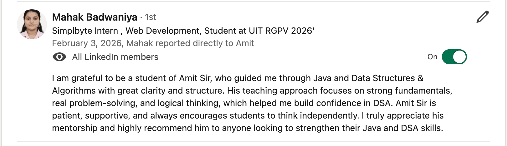 I have taken a DSA course taught by Amit at ScholarHat not long ago. He is one of the most knowledgeable and engaging instructors I have had so far. He always taught in a user-friendly manner without overusing layman terms; very willing to share his knowledge not only on DSA and Java, but how we can apply what we learn in the field and in the interview process.